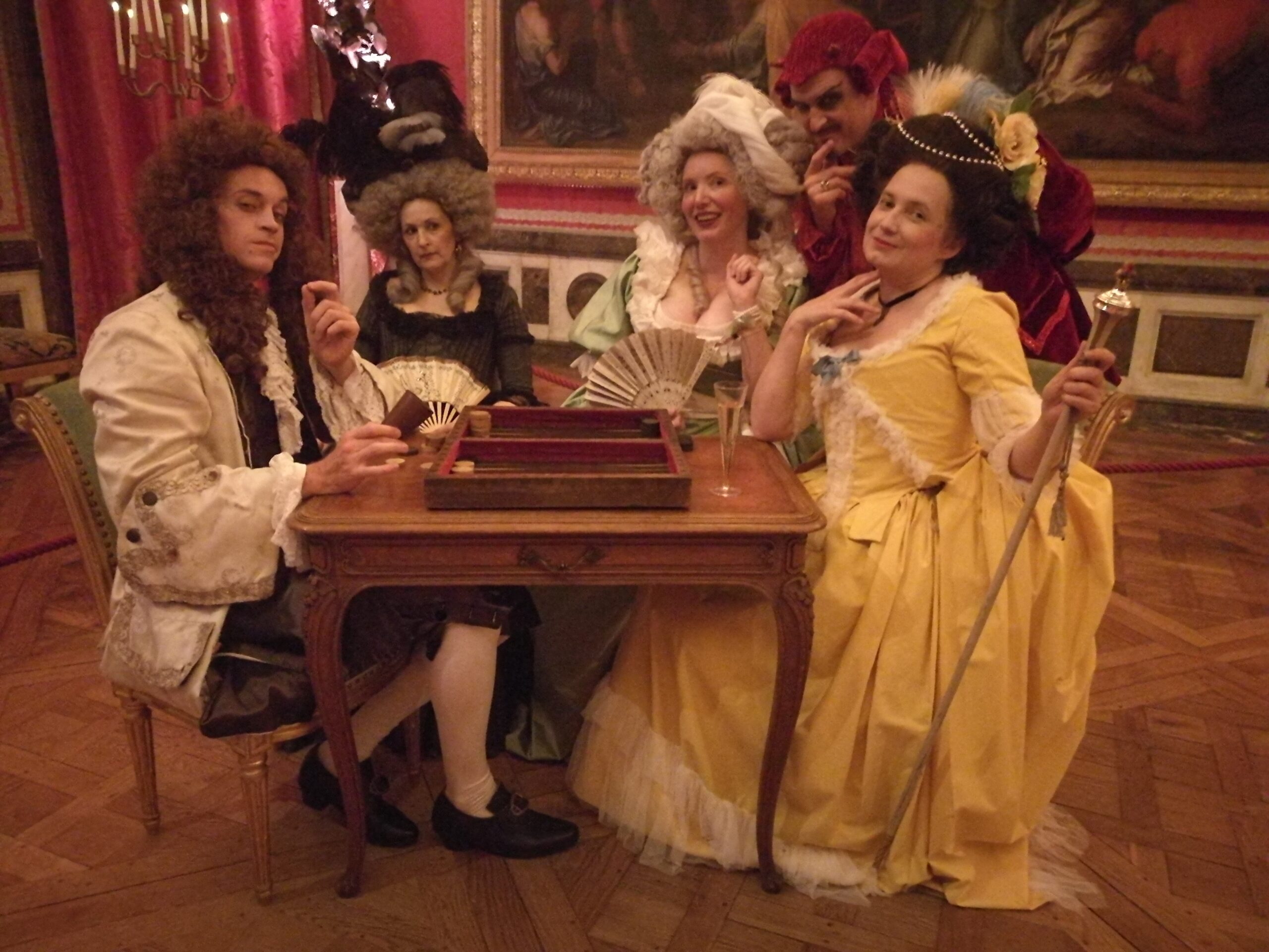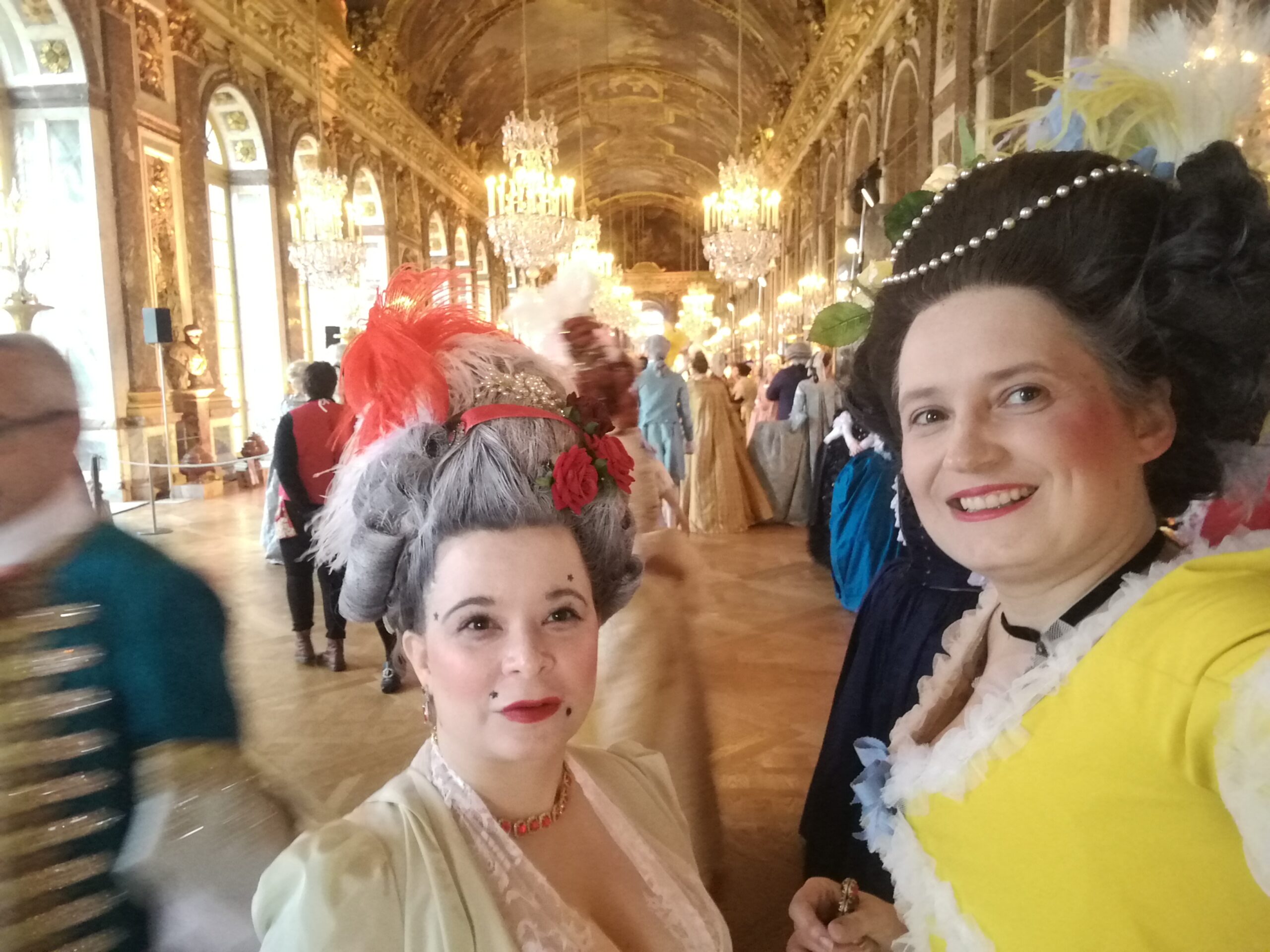 Deux soirées Grandes Eaux étaient accessibles aux costumés cette année, et ce fut l’occasion de mettre mon déshabillé galant en taffetas de soie lilas, tulle de soie blanc et organza de soie vert. J’y étais avec Kendra, et nous nous sommes rendu compte que nous étions habillées des mêmes couleurs par accident !