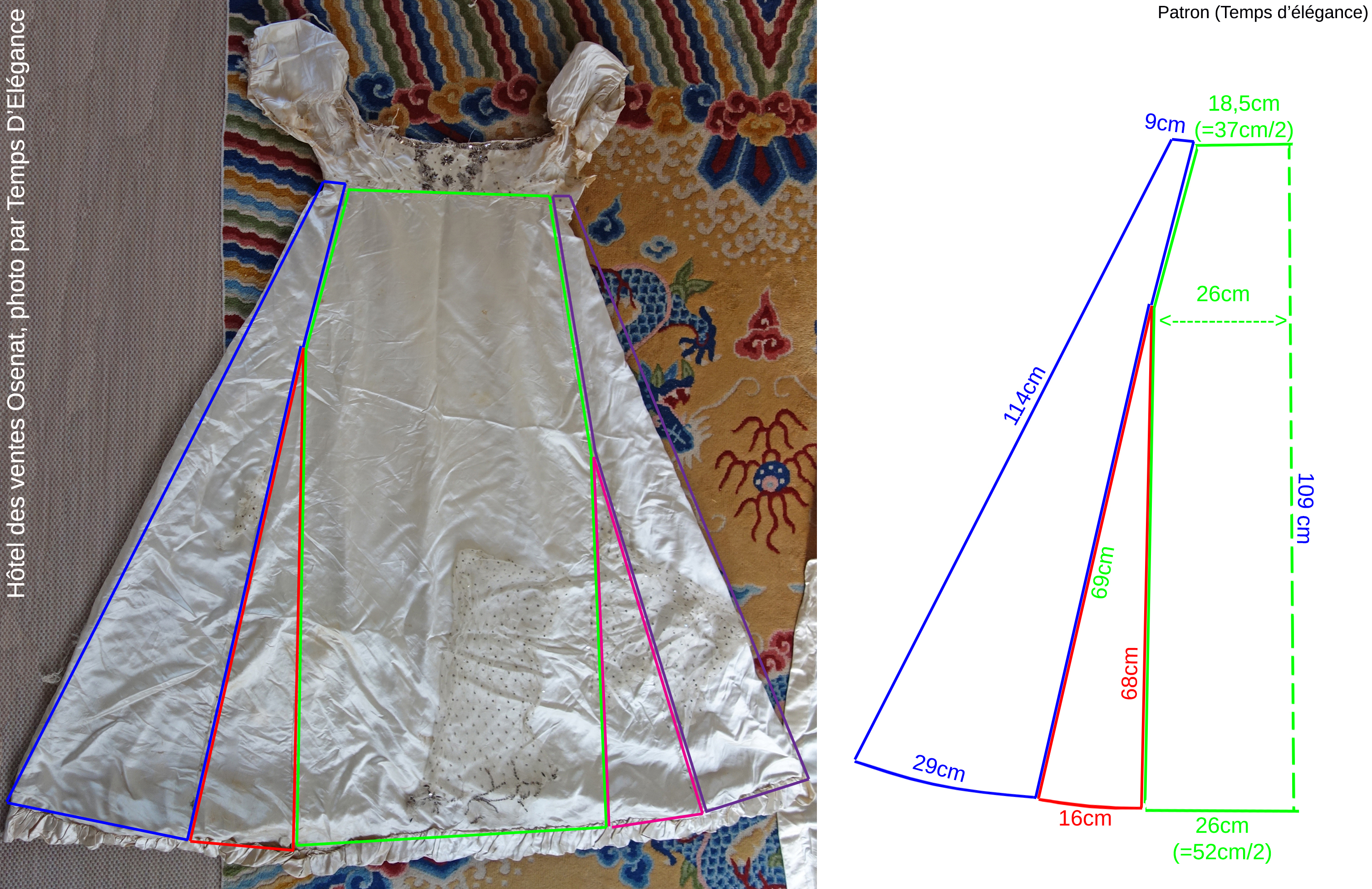 Le bas de robeVoici les dimensions des pièces au cas où vous vouliez refaire une robe avec une coupe identique (il faudra donc la remettre à votre taille, la comtesse faisait un 36 en taille “moderne” pour 1m65 environ bien que la robe semble minuscule à plat !). N’hésitez pas à cliquer sur les photos pour les agrandir : Devant : |