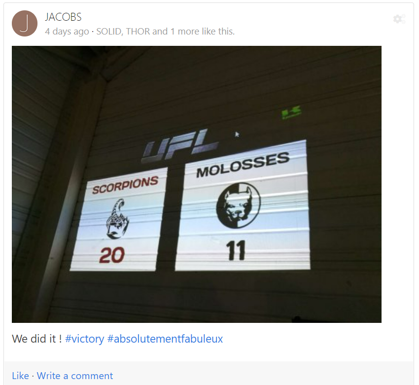 Changement de décors, avec ma participation au GN UFL organisé par JC et sa team pour l’asso eXpérience. Je jouais la coach d’une des 4 équipes finalistes d’un championnat d’un sport à mi-chemin entre du football américain et de l’ultimate fighting, c’est pour ça que je fais peur sur la 1ere photo !