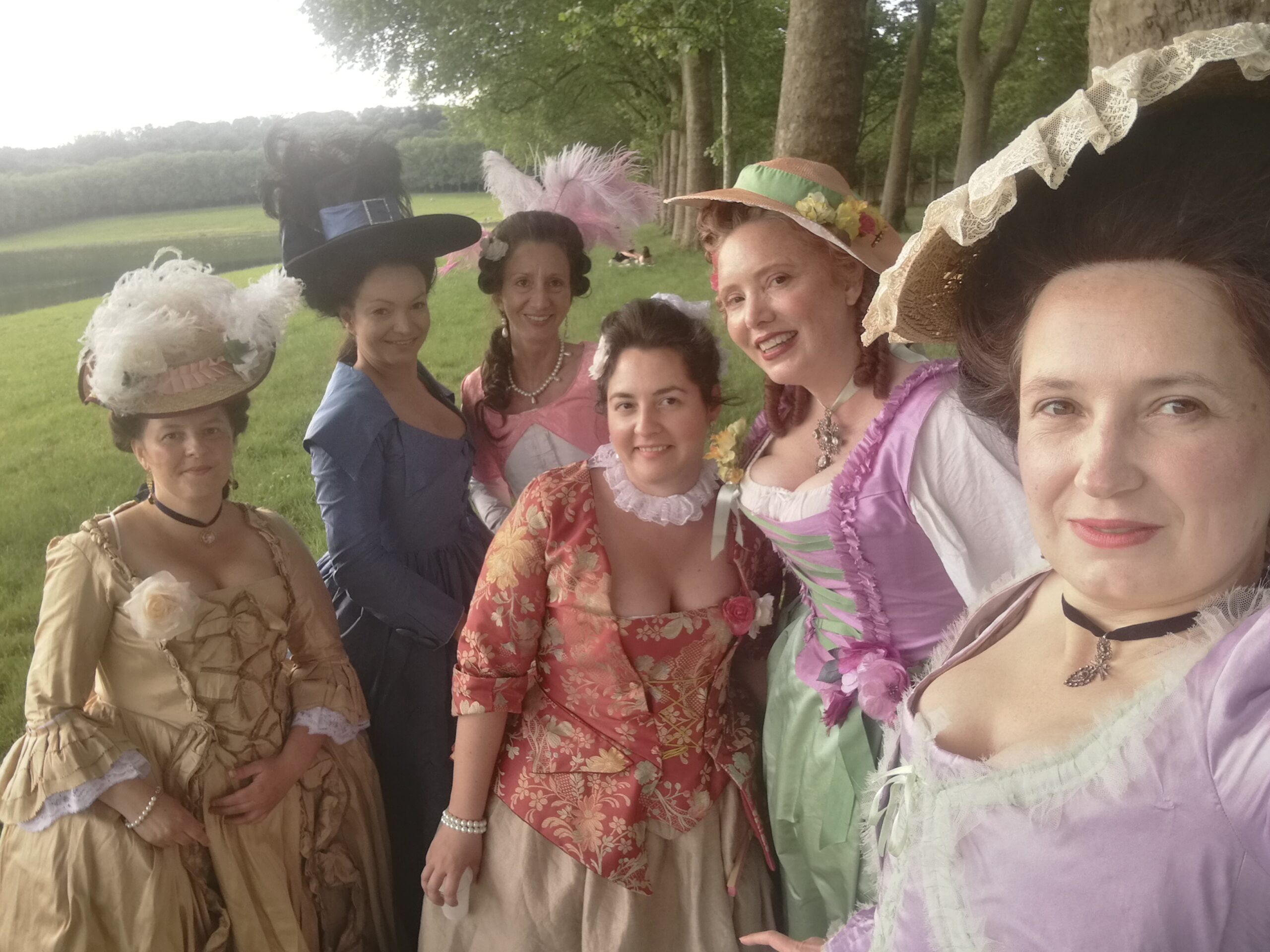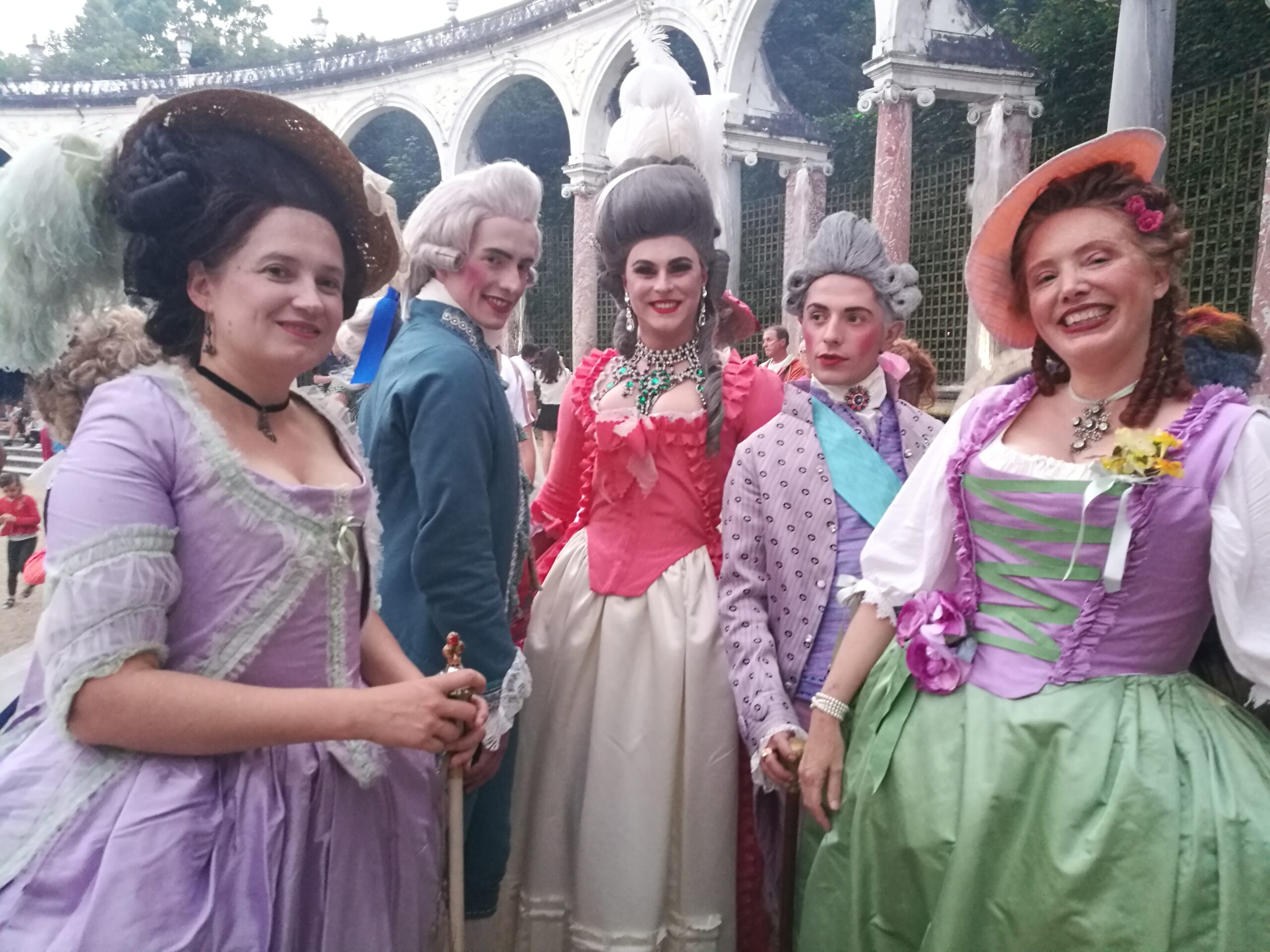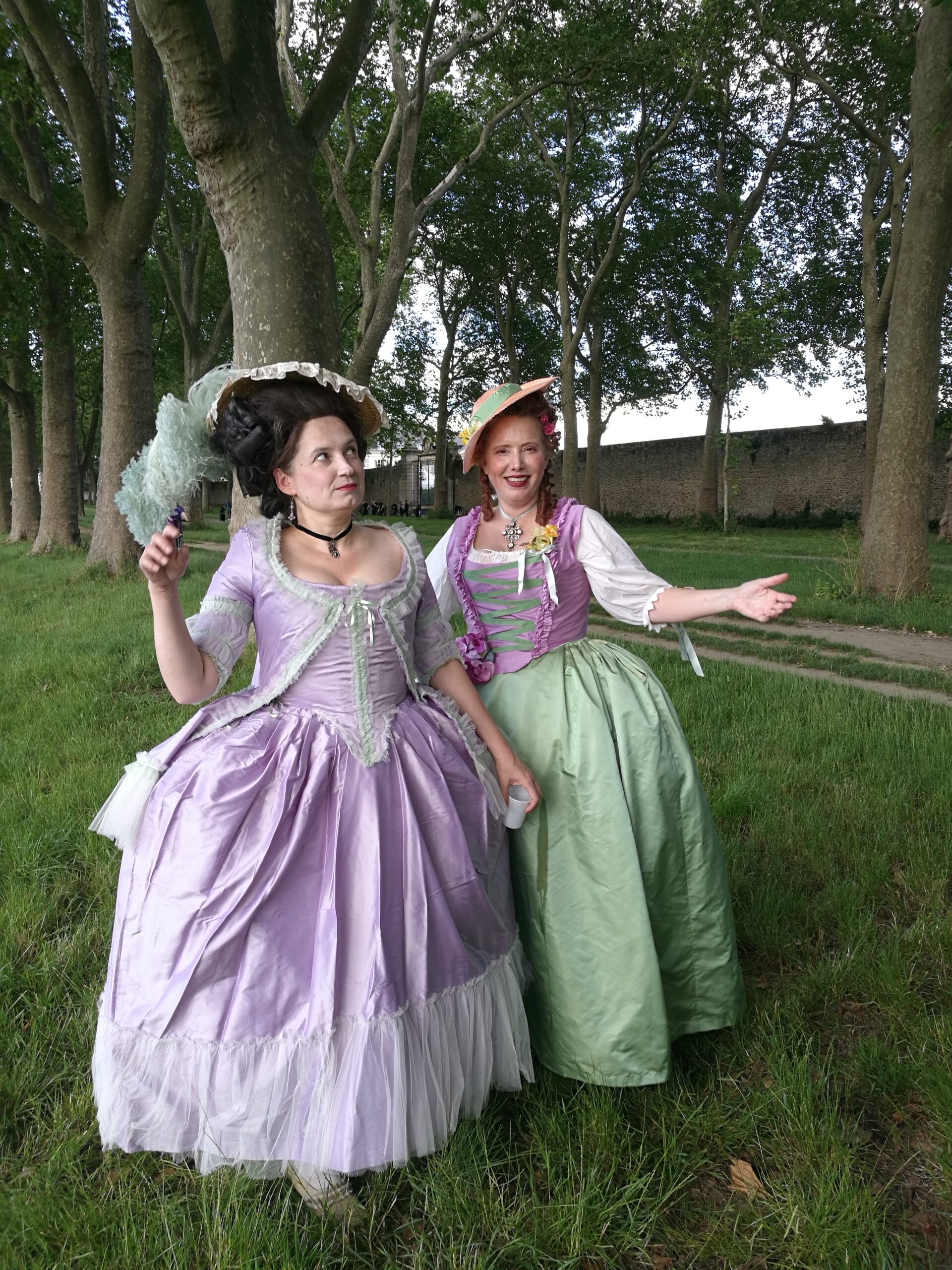 Two « Grandes Eaux » events were allowed to costumed people this year, and it was the occasion to wear my déshabillé galant made of lilac silk taffetas, white silk tulle and green silk organza. I was there with Kendra, and we realized that we were dressed in the same colors by accident!