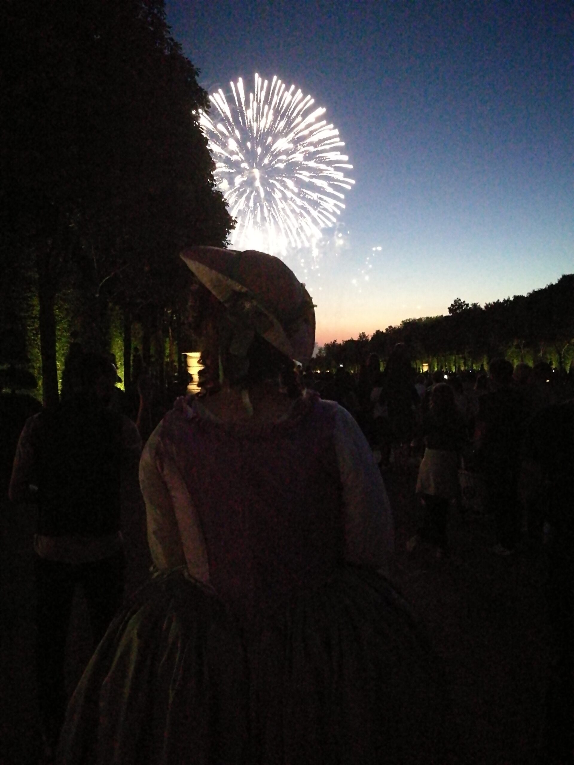 Deux soirées Grandes Eaux étaient accessibles aux costumés cette année, et ce fut l’occasion de mettre mon déshabillé galant en taffetas de soie lilas, tulle de soie blanc et organza de soie vert. J’y étais avec Kendra, et nous nous sommes rendu compte que nous étions habillées des mêmes couleurs par accident !